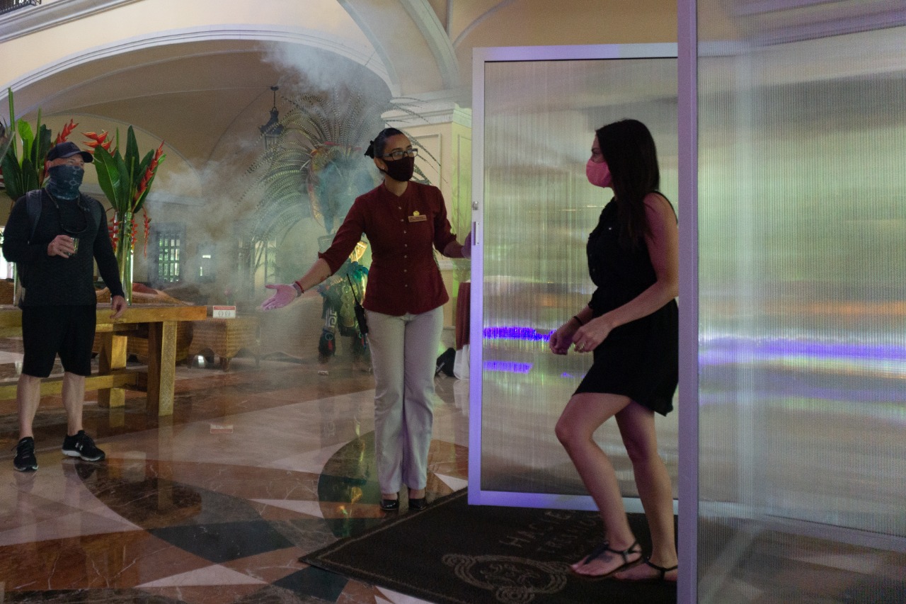 La camioneta se estacionó en el motor lobby y los huéspedes bajaron para recibir el saludo de la gerente del hotel, caminaron sobre una alfombra roja hacia una mampara donde se leía “Bienvenidos a Casa”. Después cortaron el listón de inauguración en la puerta del lobby, cruzaron el túnel sanitizante y, una vez dentro, los recibieron con un pequeño ritual maya. Los huéspedes degustaron un coctel de bienvenida mientras se les explicó el nuevo procedimiento de check in digital, para agilizar el trámite y evitar aglomeraciones. También recibieron un kit con cubre bocas, guantes y gel sanitizante, que ahora es de rigor, y firmaron el libro de visitantes distinguidos.