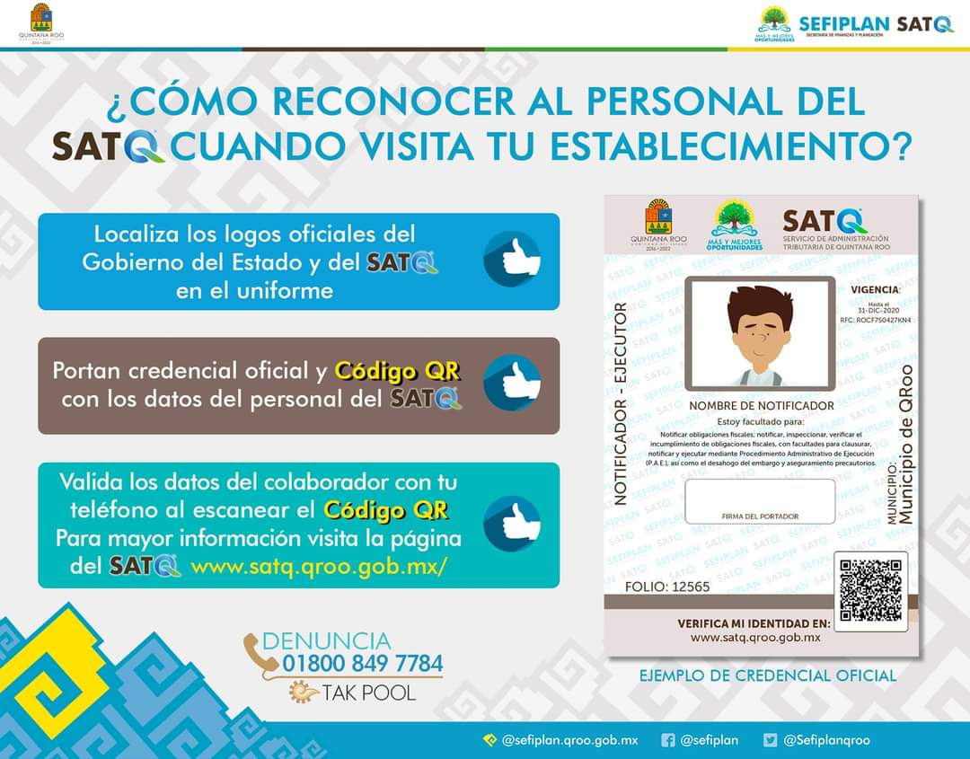 Entre las acciones que se destacan, se ha realizado la campaña al NO cobro de trámites y servicios por parte de la SEFIPLAN y el SATQ en redes sociales, y la difusión de recomendaciones a tomar en cuenta al momento de agendar una cita, en la que se menciona que tiene que ser a nombre del propietario y/o representante legal, además de la identificación de los notificadores que portan uniforme con logotipos de Gobierno del Estado, llevando consigo su credencial con código QR para verificar su información a través del portal www.satq.qroo.gob.mx.