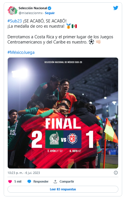 Poder y Crítica | Redacción | La Selección Mexicana Sub 23 se quedó con la medalla de oro tras vencer 2-1 a Costa Rica en la final del futbol varonil de los Juegos Centroamericanos y del Caribe de San Salvador 2023, cumpliendo así con la expectativa que se tenía del representativo Tricolor.
