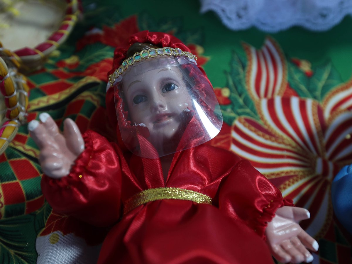 En el kiosco de Eloísa abundan los vestuarios tradicionales para la imagen del Niño Jesús, con flecos y bordados de colores que replican el estilo de la colonia, pero también los trajes enteros, similares a aquellos de material sintético que la gente más precavida usa a diario en la calle para evitar el contagio.