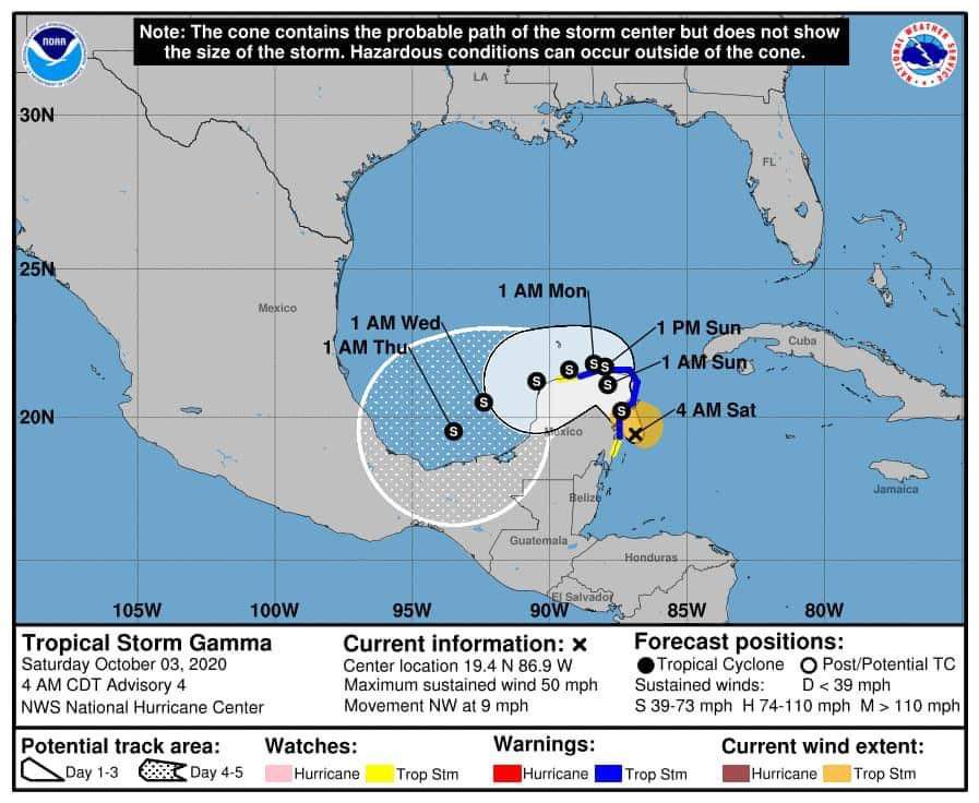 Según la última actualización, la entrada de la tormenta tropical #Gamma será hoy sobre #Tulum aprox. a la 1 p.m. y saldrá de nuestro territorio aprox. 1 a.m. del domingo 4 de octubre. No salgan de casa, eviten las compras de pánico y manténganse informados en cuentas oficiales. pic.twitter.com/SR928inzAQ