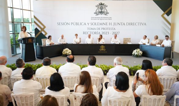 PODER Y CRÍTICA | REDACCIÓN | Con pleno respeto a la autonomía universitaria, la gobernadora Mara Lezama Espinosa asistió a la Sesión Pública y Solemne de la Junta Directiva de toma de protesta de la Rectoría de la Universidad Autónoma de Quintana Roo (UAQROO) 2023-2027, que dirige la doctora Consuelo Natalia Fiorentini Cañedo.