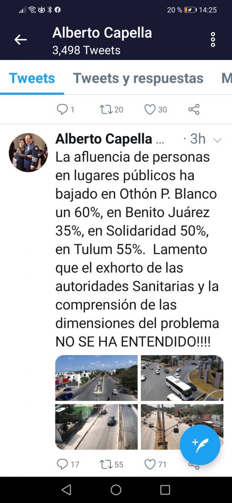 Cancún, 04 de abril.- Al anticipar el posible establecimiento de medidas rigurosas para que la gente en verdad entienda, el secretario estatal de Seguridad Pública, Alberto Capella Ybarra, lamentó que la ciudadanía no está cooperando para no salir a la calle.