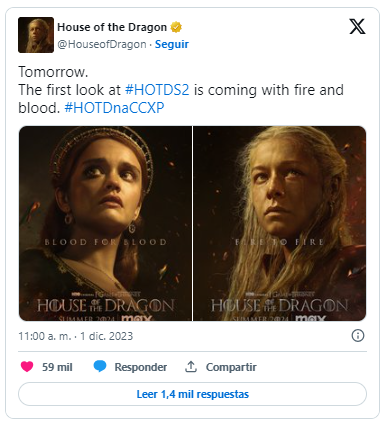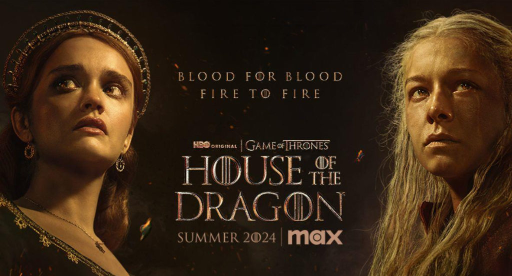 Los banners oficiales muestran a la reina Rhaenera Targaryen (Emma D’arcy) y Alicent Hightower (Emily Carey) con las frases “Blood for blood” y “Fire to fire” respectivamente. Por otra parte, algunos medios informan que mañana habrá más imágenes promocionales de lo que será la segunda temporada de esta serie.