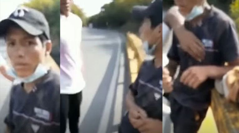 Cuando Silvano responde “soy de Perú”, el hombre que no está grabando, lo levanta de las pantorrillas para luego lanzarlo desde lo alto del puente.