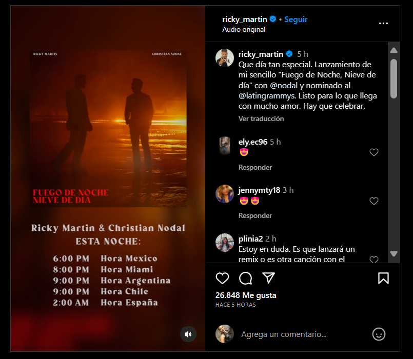 “Fuego de noche, nieve de día, 19 de septiembre |8:00pm. Volver a grabar esta canción que ha conectado con tanta gente y que 27 años después lo sigue haciendo ha sido algo muy sanador para mí. Además, poder hacerlo con alguien como Nodal que está haciendo cosas maravillosas en la música, lo hizo aún más especial”, escribió Ricky Martin.