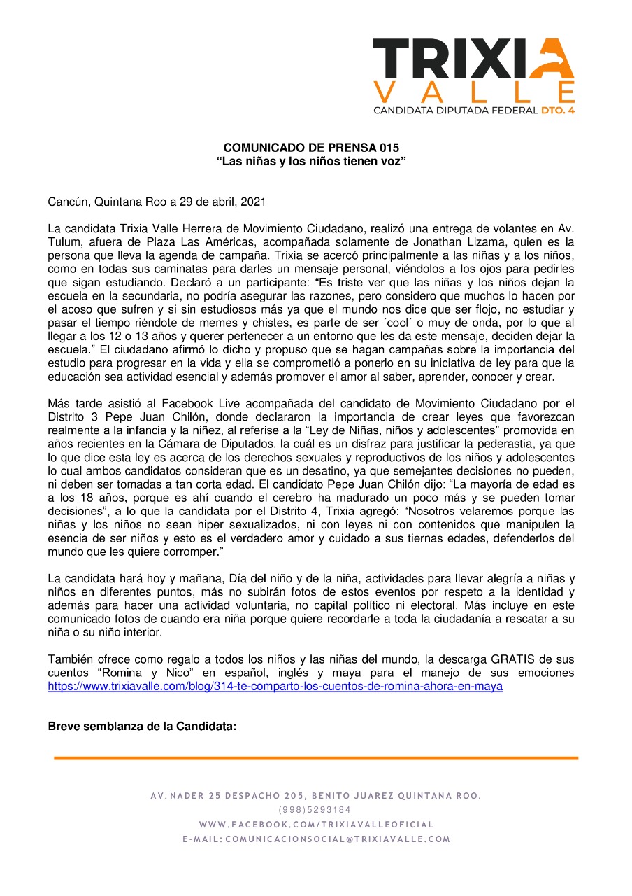 La candidata hará hoy y mañana, Día del niño y de la niña, actividades para llevar alegría a niñas y niños en diferentes puntos, más no subirán fotos de estos eventos por respeto a la identidad y además para hacer una actividad voluntaria, no capital político ni electoral. Más incluye en este comunicado fotos de cuando era niña porque quiere recordarle a toda la ciudadanía a rescatar a su niña o su niño interior.