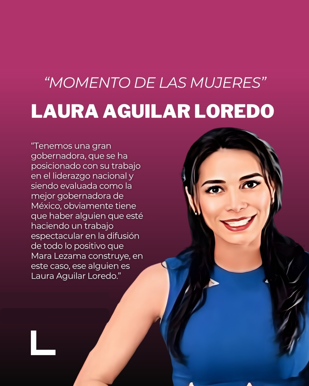 “Si tenemos una gran gobernadora, que se ha posicionado con su trabajo en el liderazgo nacional…Obviamente tiene que haber alguien que esté haciendo un trabajo espectacular en la difusión de todo lo positivo que se construye, en este caso, ese alguien es Laura Aguilar Loredo. La Coordinadora general de Comunicación Social desde 2024…Con vasta experiencia en relaciones públicas, comunicación y estrategias mediáticas, Laura ha actualizado la difusión gubernamental, manejando campañas que resaltan éxitos femeninos y causas sociales, sin perder de vista una estrategia que, sin lugar a dudas…Una mujer líder, referente en política a nivel nacional”, dice en referencia a la funcionaria una publicación de circulación reciente.