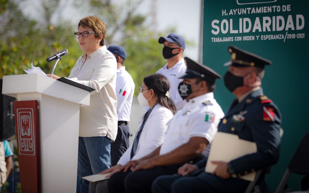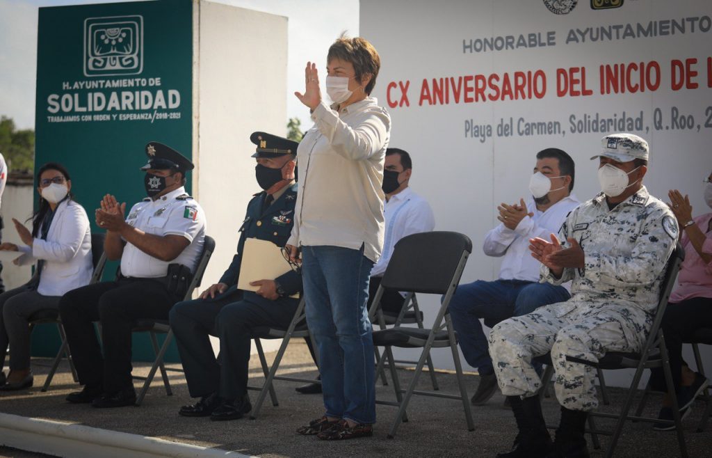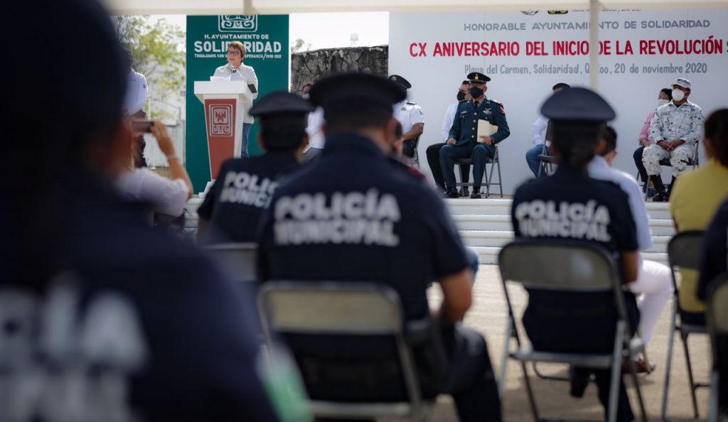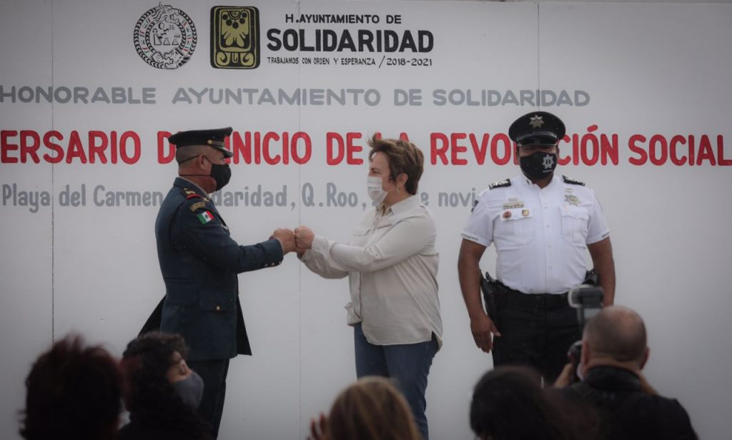 Playa del Carmen, Q. Roo, viernes 20 de Noviembre de 2020, poderycrítica.- La presidenta municipal, Laura Beristain Navarrete enfatizó que los municipios hoy son el primer eslabón de la Cuarta Transformación de México, al encabezar el acto conmemorativo del 110 Aniversario del Inicio de la Revolución Mexicana, acompañada de autoridades civiles y militares, entre las que se encontraba, en representación de la Secretaría de la Defensa Nacional (Sedena), el capitán Víctor Manuel Reyes Ramírez.