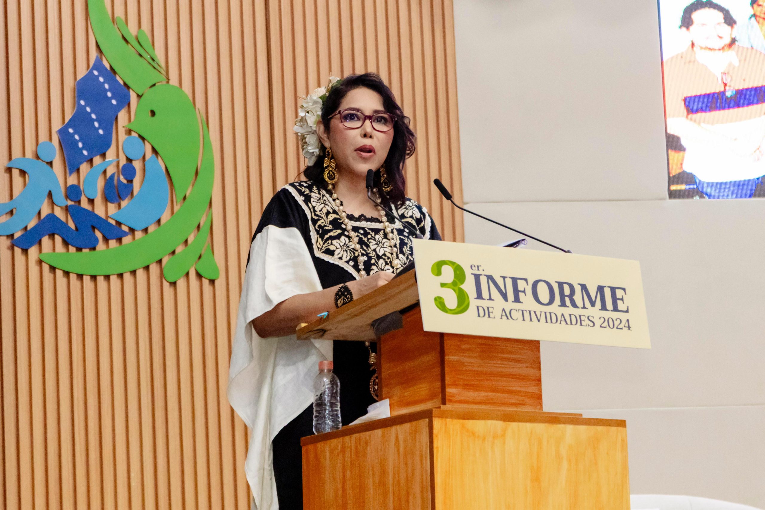 Durante su Informe, la presidenta del organismo hizo especial mención a la Gobernadora, Layda Sansores San Román, a quien reconoció por su respaldo a las instituciones que promueven la justicia y la dignidad humana.