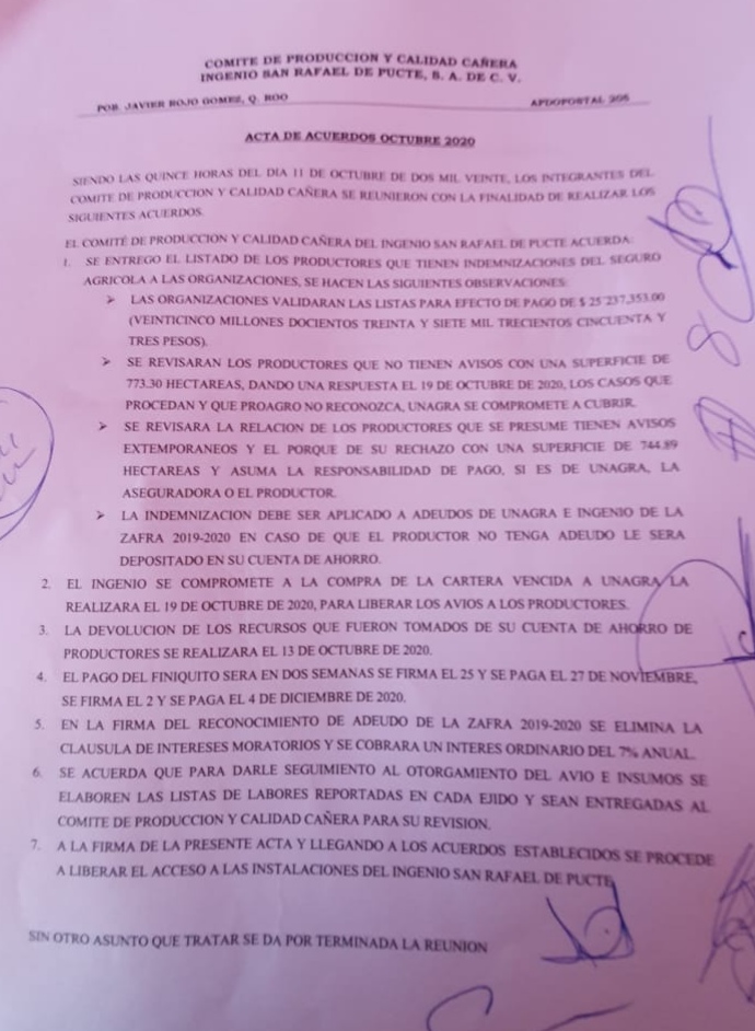 Othón P. Blanco, Q. Roo, Lunes 12 de Octubre de 2020, poderycrítica .- Productores y el ingenio San Rafael de Pucté firmaron un acta de acuerdos con lo que, luego de casi dos semanas, fue levantada la huelga en la fábrica de la comunidad de Javier Rojo Gómez en la ribera del río Hondo.