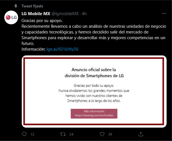 Estados Unidos, Lunes 05 de Abril de 2021, poderycrítica.- La empresa LG Electronics dio a conocer a través de sus redes sociales que cerrará su unidad de negocio móvil; Esta decisión fue aprobada por su junta directiva este 5 de abril tras registrar pérdidas millonarias durante los últimos seis años.