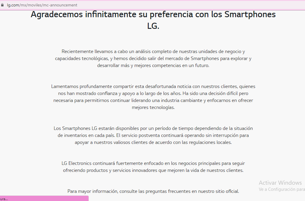 LG estima que el cierre del negocio de telefonía móvil se complete para el 31 de julio, aunque el inventario de algunos modelos existentes aún puede estar disponible después de esa fecha.