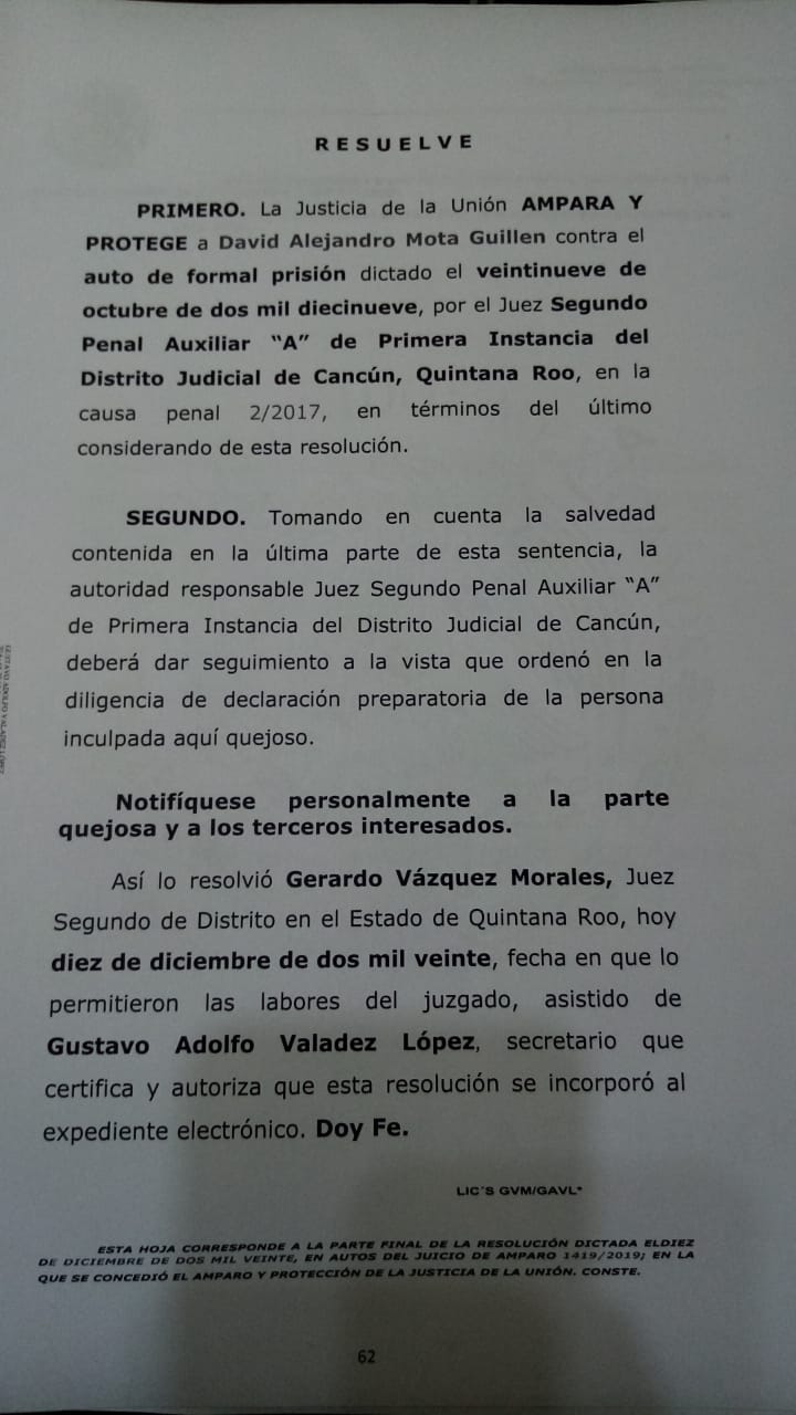 Cancún, Q. Roo, Viernes 11 de Diciembre del 2020, poderycrítica.-  David Alejandro Mota Guillén, quien fue señalado como presunto jefe del cártel del Golfo en Quintana Roo, fue liberado tras obtener un amparo de un juez federal.