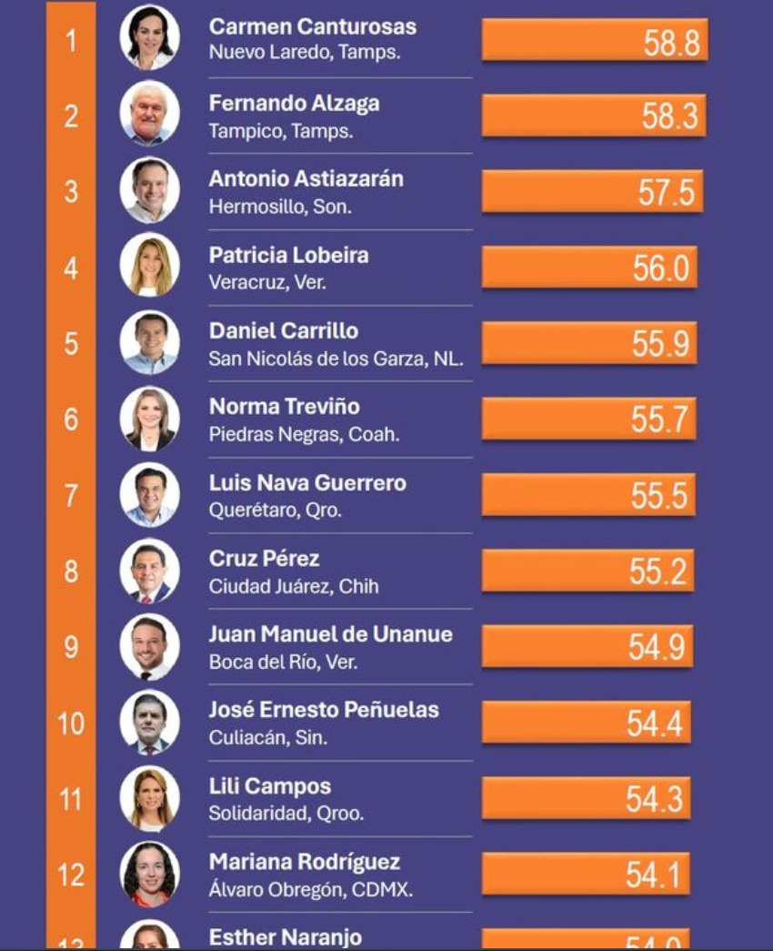 En general, los alcaldes tienen una evaluación baja, ya que la más alta es la presidenta municipal de Nuevo Laredo, Tamaulipas, con aprobación de 58.8%, es decir, que en escala de cero a 100, resultaría reprobada, pero es la más alta.