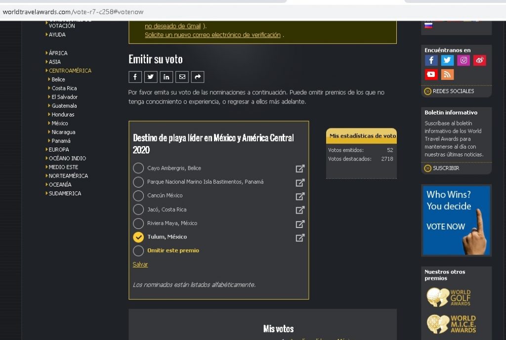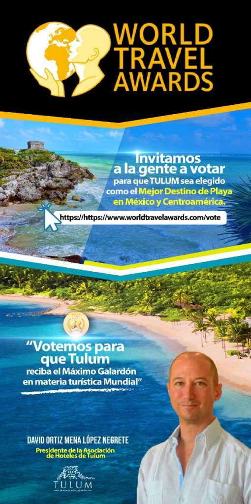 Tulum, Q. Roo, Lunes 21 de septiembre del 2020, poderycrítica.- El presidente de la Asociación de Hoteles de Tulum (AHT), David Ortiz Mena López Negrete hizo un llamado a la población quintanarroense para que participe en los World Travel Awards (WTA), “el Oscar” del Turismo, votando por Tulum como el “Destino de Playa líder en México y América Central 2020”, en la el sitio www.worldtravelawards.com/vote.