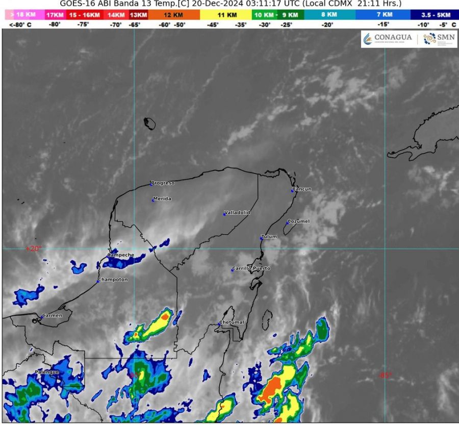 En la Península de Yucatán habrá cielo medio nublado a nublado durante el día, con lluvias puntuales fuertes en Quintana Roo; las cuales podrían originar encharcamientos e inundaciones; así como chubascos en Campeche y Yucatán. Por la mañana, ambiente templado y durante la tarde, ambiente cálido. Viento de componente norte de 20 a 30 km/h con rachas de 40 a 60 km/h en costas de costas de la península.