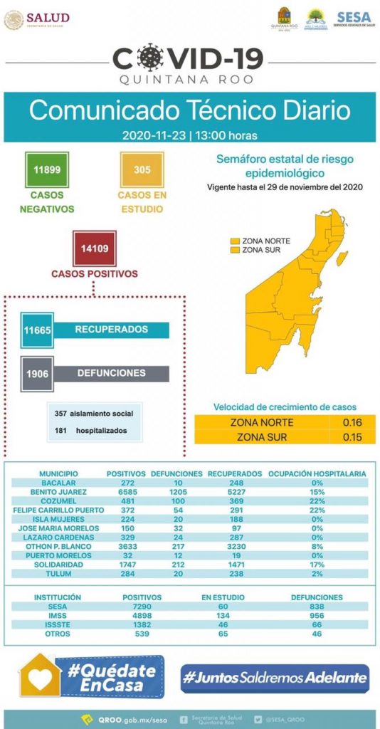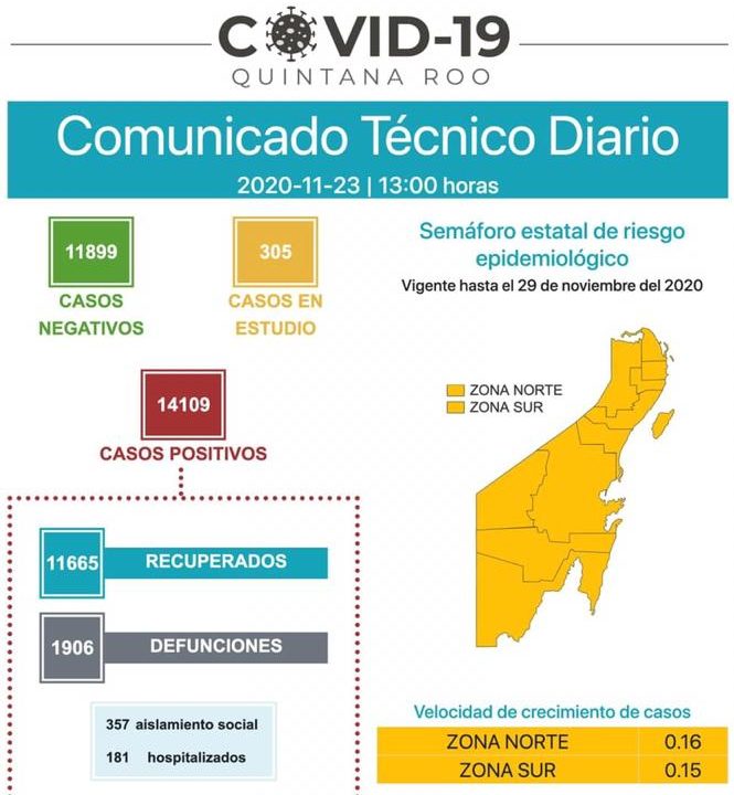 De acuerdo a la velocidad de crecimiento de casos la zona norte disminuyó el 0.16 en tanto que la zona sur al 0.15. De acuerdo al semáforo estatal de riesgo epidemiológico todo Quintana Roo se encuentra en color amarillo.