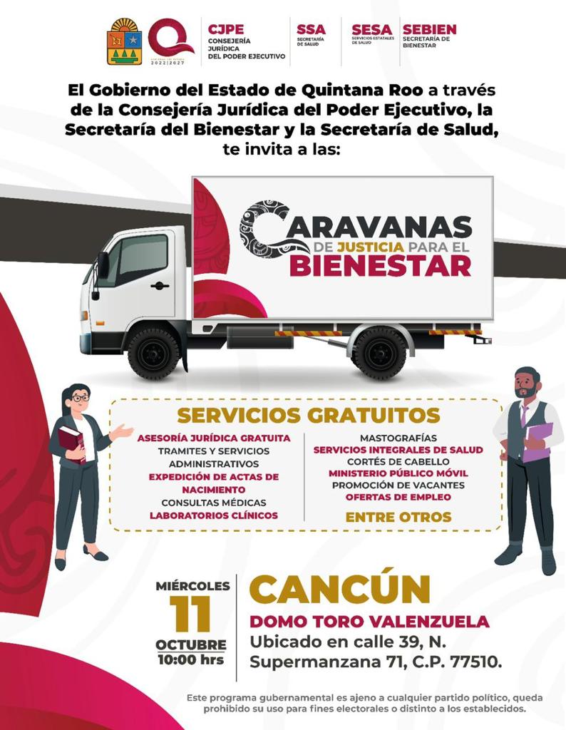 PODER Y CRÍTICA | REDACCIÓN | En unidad con el gobierno de Quintana Roo, Ayuntamiento de Benito Juárez, invita a las y los cancunenses a las “Caravanas de Justicia para el Bienestar”, que se instalarán este miércoles 11 de octubre en las instalaciones del Domo Toro Valenzuela, ubicado en la calle 39 de la Supermanzana 71, acercando a partir de las 10:00 horas diversos servicios gratuitos a la ciudadanía.