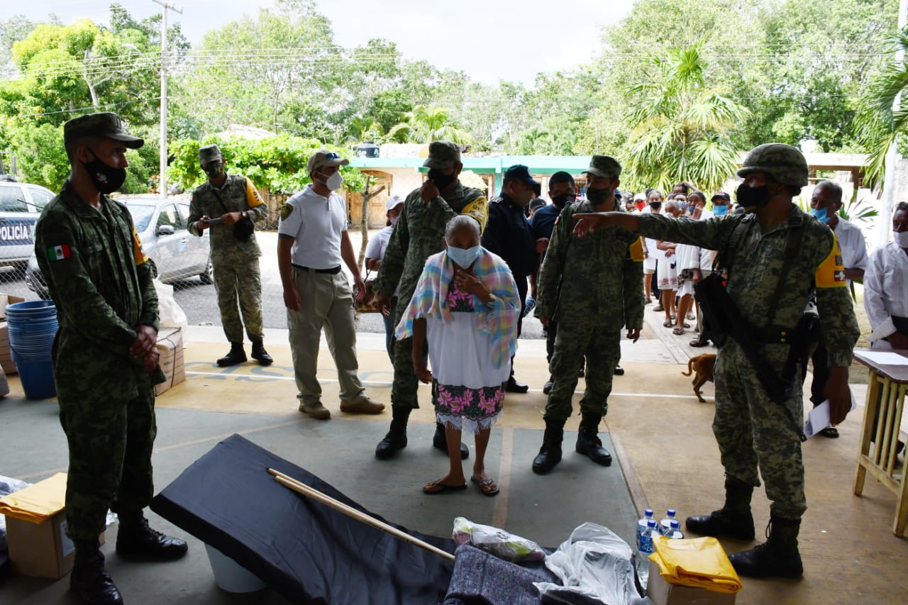 Lázaro Cárdenas, Q. Roo, Lunes 26 de Octubre del 2020, poderycrítica.- Por instrucciones del Presidente municipal L. C. P. Nivardo Mena Villanueva, el director de protección civil Alejandro Erosa Betancourt y el director de seguridad pública y tránsito municipal José Elías Góngora Chimal, acudieron a brindar apoyo a elementos del ejército que entregaron apoyos por contingencia a las comunidades de San Francisco, San Cosme, El Naranjal y Constituyentes.