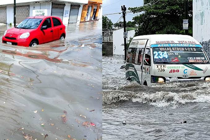 La precipitación anegó avenidas principales en el centro de Cancún y zonas aledañas, como avenida La Luna, Nichupté y Del Bosque, con reportes de autos atrapados en medio de los grandes encharcamientos.
