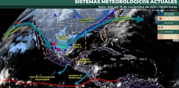 El Frente Frío No.09, localizado en superficie y se ubica sobre la porción norte y oriental de la República mexicana, porción noroeste del Golfo de México y hasta la porción oriental de los EUA.; genera descenso de temperaturas, nubosidad variable con nubes de tormenta, con lluvias acompañadas de chubascos con probabilidad de actividad eléctrica dispersa, viento frío y arrachado del norte y noreste, por el momento no presenta influencia para la península de Yucatán y estado de Quintana Roo.