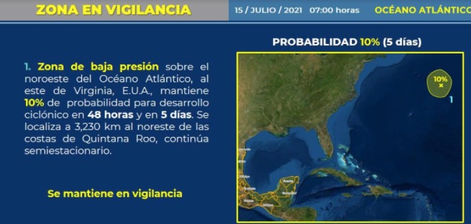 Agrega que un área de actividad de lluvias asociada a una baja presión subtropical, ubicada a varios cientos de kilómetros al sur-suroeste de Cape Race, Terranova, EUA., ha evolucionado poco en las últimas horas. Las condiciones ambientales son algo limitadas, y se espera poco desarrollo adicional, el próximo viernes, se proyecta que la baja presión se acelere hacia el noreste y se abren en un canal de baja presión hacia el sur del Atlántico canadiense.