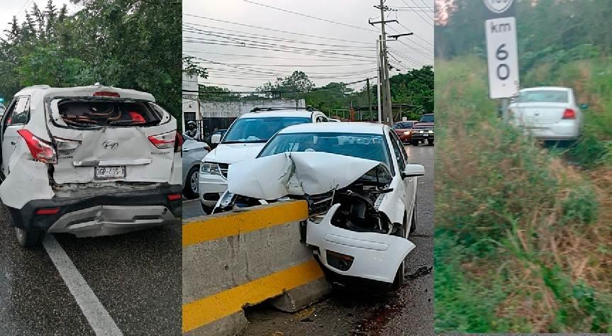 Uno de los percances ocurrió en la carretera Villahermosa – Nacajuca, con dirección a la capital tabasqueña, donde se vieron involucrados dos vehículos y una motocicleta. Los dos pasajeros de la moto sufrieron golpes y raspones.