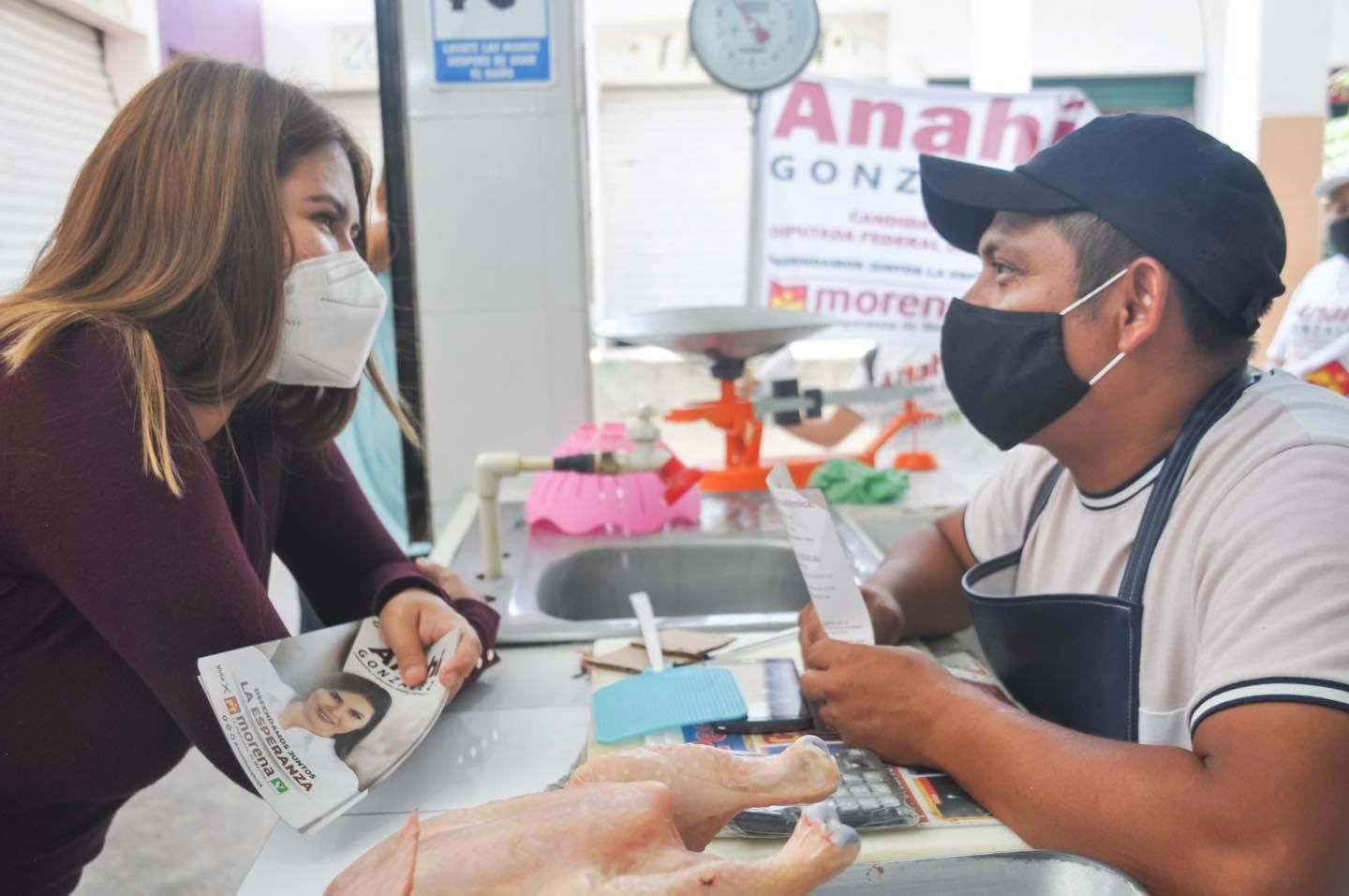 Chetumal, Q. Roo, miércoles 05 de mayo de 2021, poderycrítica.- A nivel de suelo, con el sello característico de su campaña, la candidata a Diputada Federal por el Distrito 2, por la coalición «Juntos Hacemos Historia», Anahí González Hernández, recorrió mercados públicos de Chetumal.