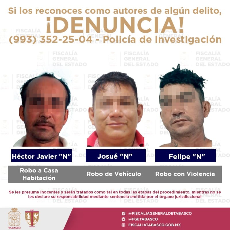 En la capital del estado fueron detenidos Héctor Javier «N» y Felipe «N». El primero fue notificado del mandato judicial en el CERESO de Villahermosa, por su probable participación en el delito de robo a casa habitación y daños.