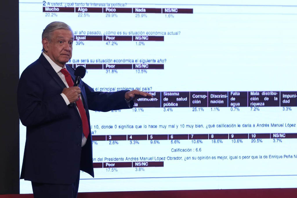 «Hay oposición al Gobierno, eso es legítimo, no aspiramos al pensamiento único (…) Aun así, la gente nos está apoyando», dijo el presidente en conferencia de prensa antes de presentar la encuesta.