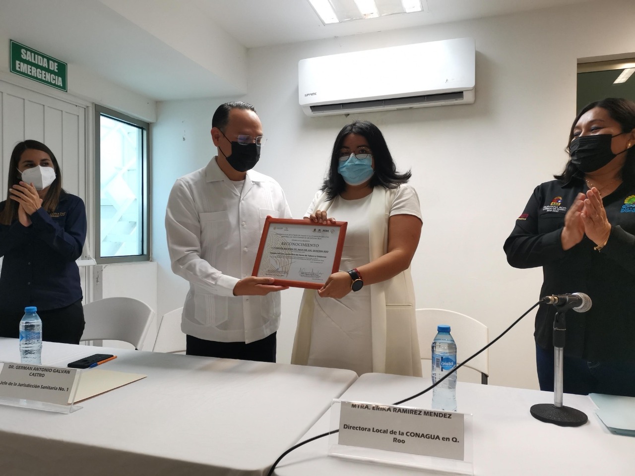 Al respecto, en representación de la secretaria de Salud Alejandra Aguirre Crespo, el jefe de la Jurisdicción Sanitaria número uno, Germán Antonio Galván Castro entregó a las autoridades locales de la Comisión Nacional del Agua (CONAGUA) el distintivo que acredita sus oficinas como “Edificio 100% Libre de Humo de Tabaco”.