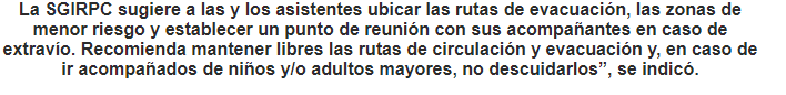 Las autoridades indicaron que, en caso de emergencia, se pide al público atender las instrucciones del personal de la SGIRPC y de la Secretaría de Seguridad Ciudadana.