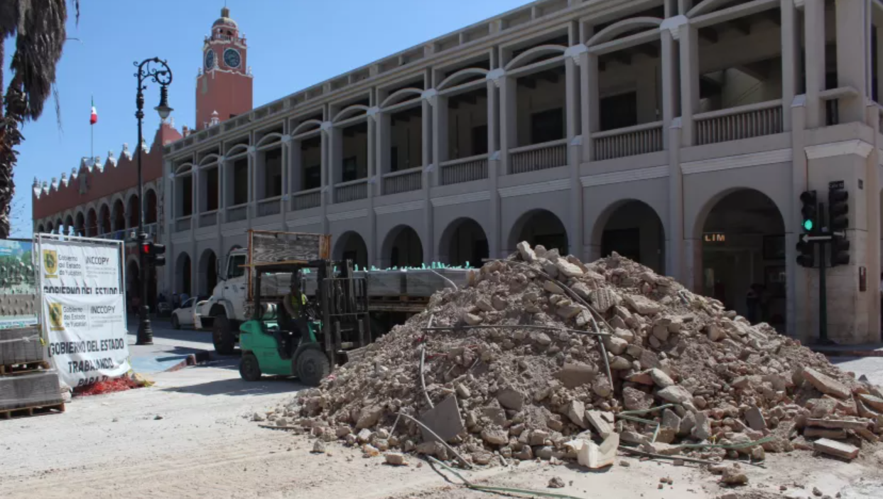 Poder y Crítica | Redacción | Siguen a marchas forzadas la realización de los trabajos de remodelación de la Plaza Principal de Mérida deberán quedar listos a finales de agosto.