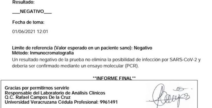 «Buenos días a todas y todos, espero se encuentren muy bien al igual que todos por casa. Con respecto al anuncio del resultado positivo de Covid del ex Presidente Calderón, con quien estuvimos la semana pasada, algunos candidatos, les comento que desde que la campaña comenzó, como medida de responsabilidad y precaución, decidí hacerme una prueba de antígenos cada tercer día por control y para no poner a nadie en riesgo, y así lo he venido haciendo. Justamente hoy por la mañana me tocaba y aquí les comparto mi resultado», informó en sus redes sociales y mostrando el resultado negativo.