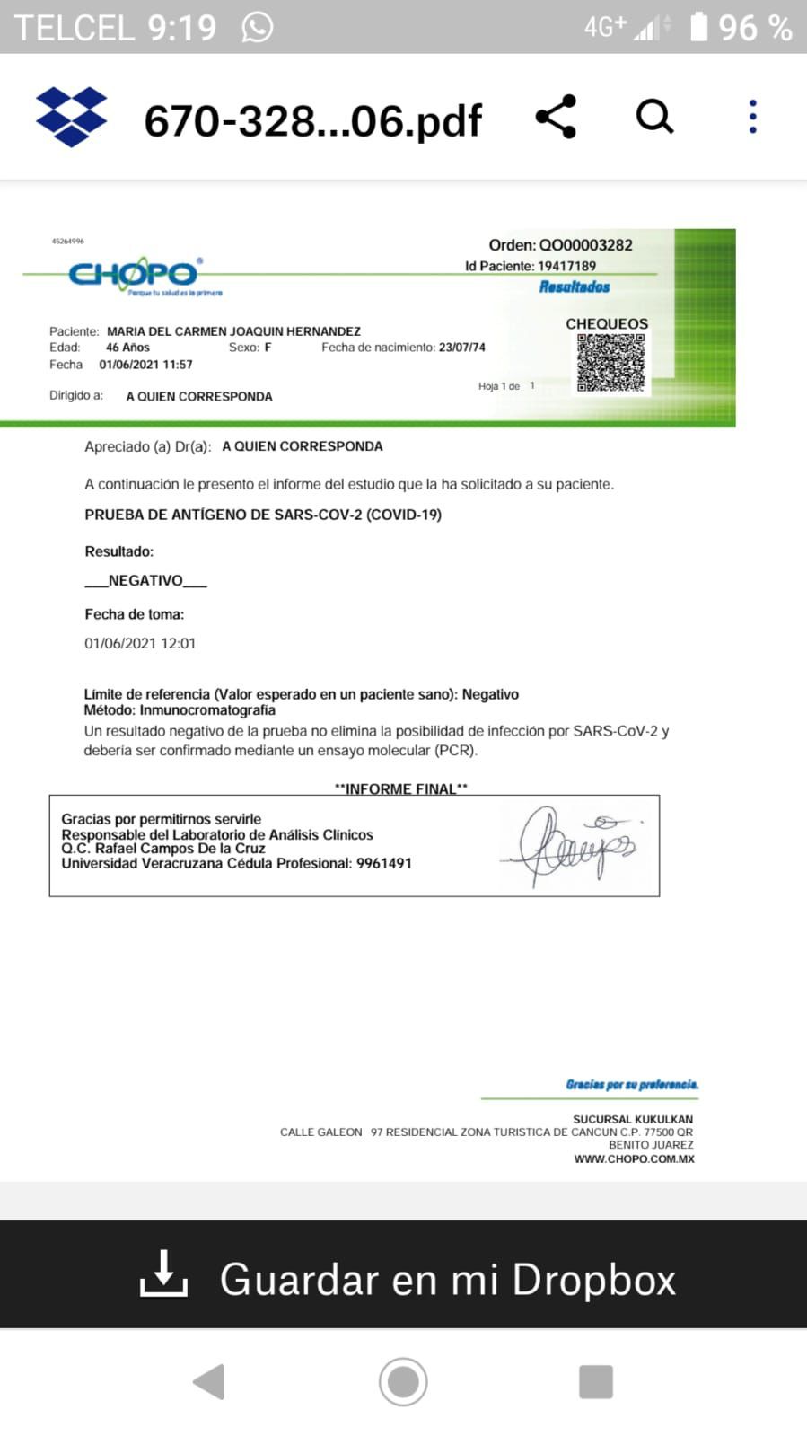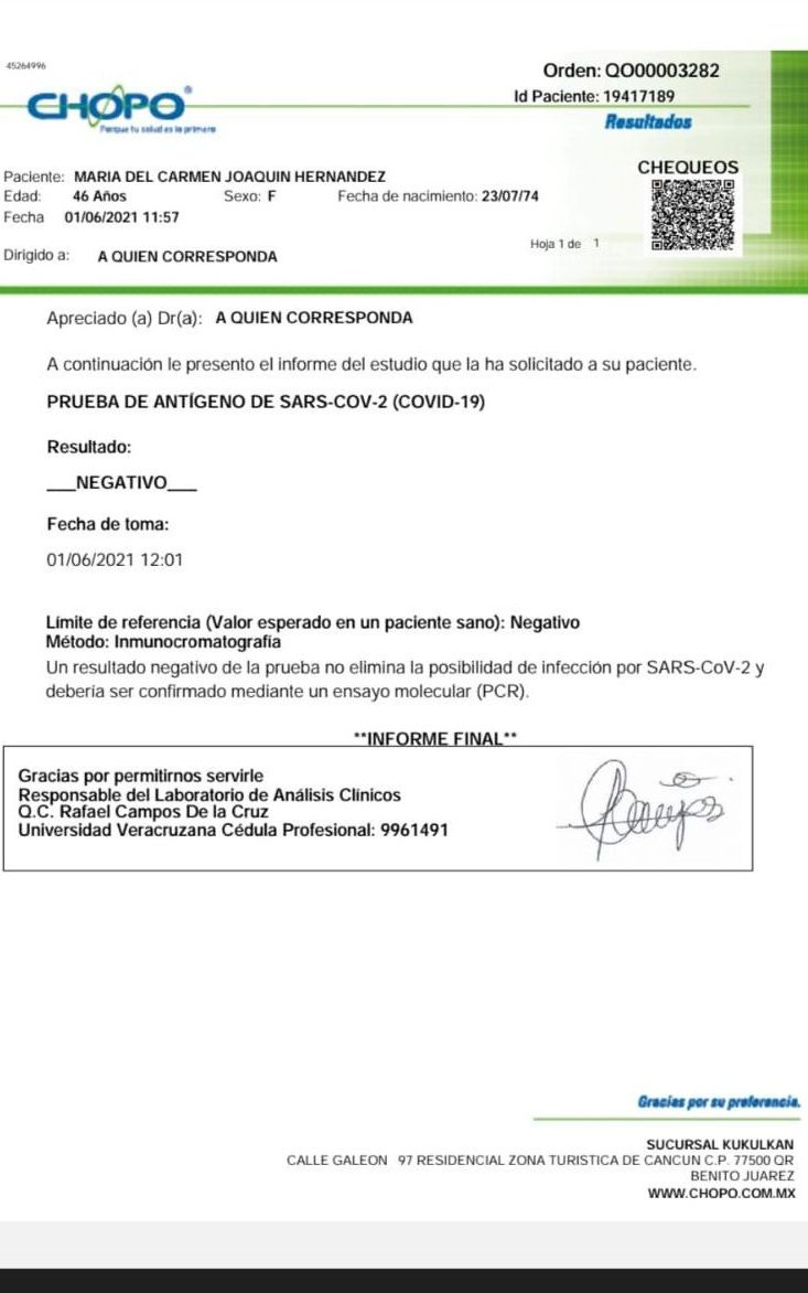 Cancún, Quintana Roo, miércoles 02 de junio del 2021, poderycritica.- Luego de que Felipe Calderón dio positivo a covid-19 y haber estado en Cancún y Cozumel, la candidata a diputada federal por el distrito 4, por la coalición «Va por México», Carmen Joaquín Hernández, informó que se hizo una nueva prueba y dio negativo.