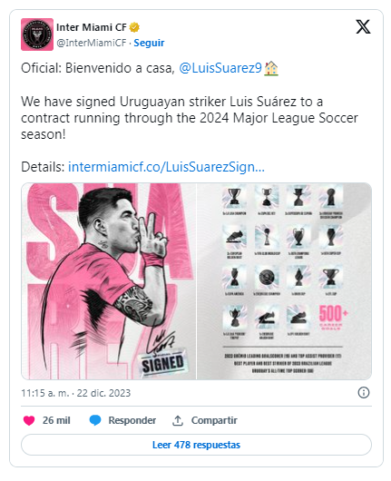 «Estamos felices de darle la bienvenida a nuestro club al delantero de clase mundial Luis Suárez… que viene de una gran temporada en el futbol de Brasil. Será un jugador clave en nuestro plantel», dijo uno de los propietarios del Inter Miami, Jorge Mas al anunciar la llegada del ‘Pistolero’, máximo goleador histórico de la selección uruguaya (68 tantos) y tercero del Barcelona, con 198 tantos.