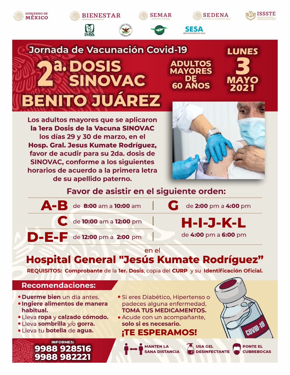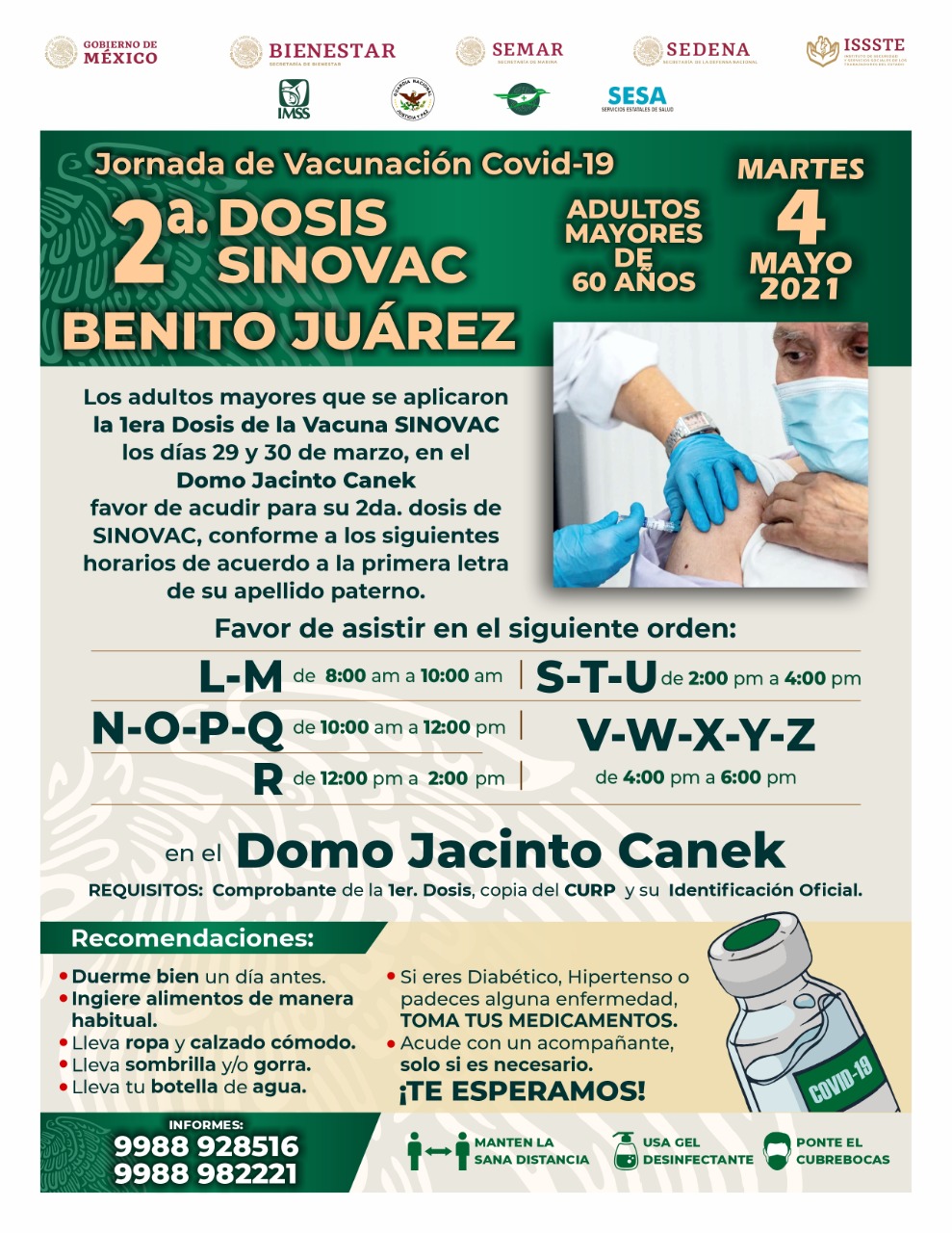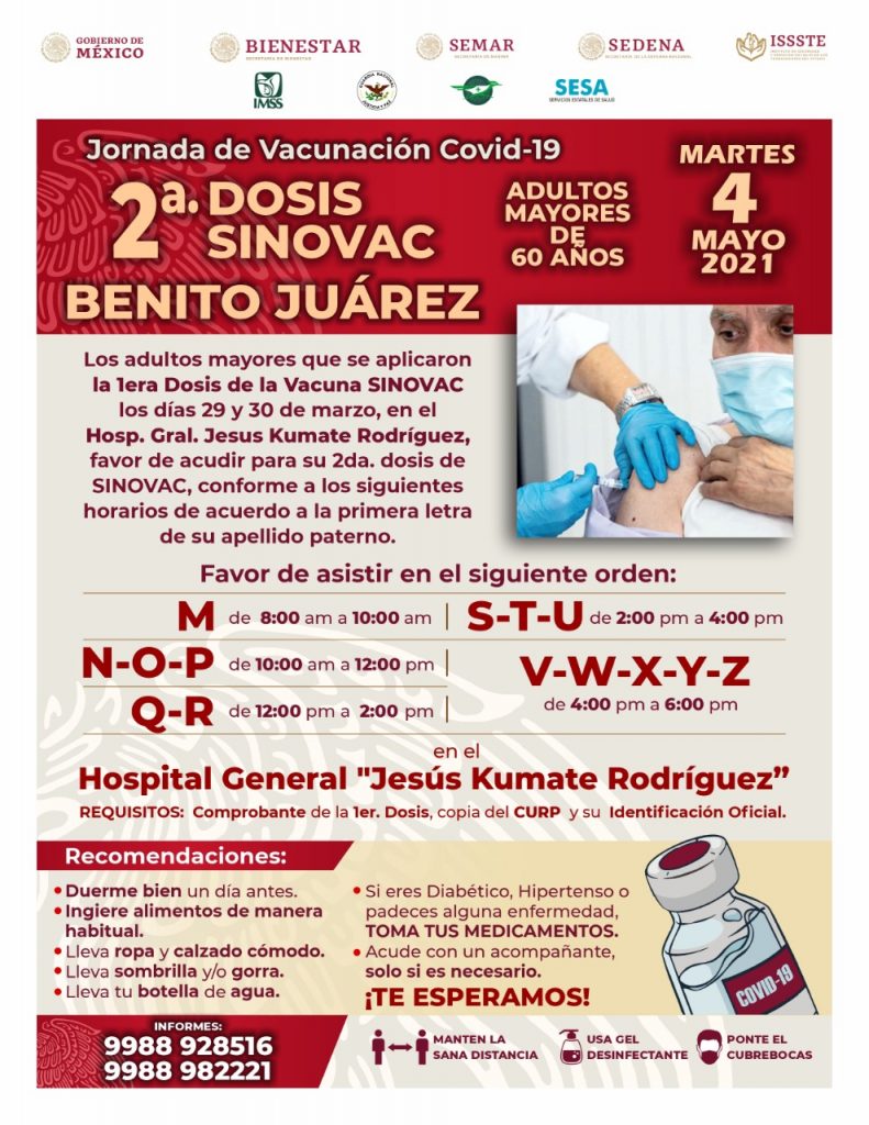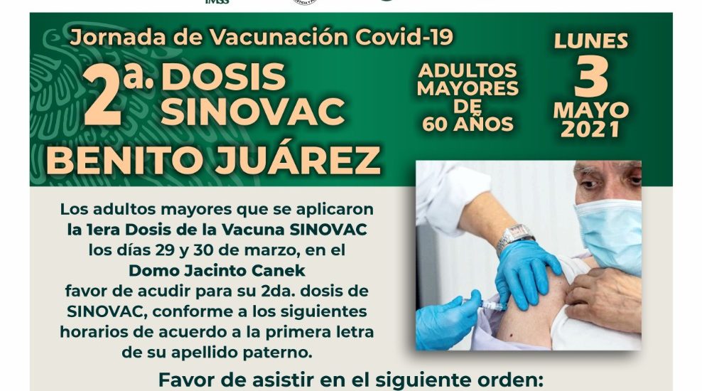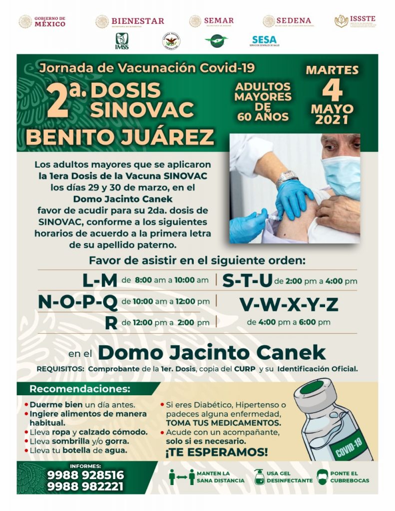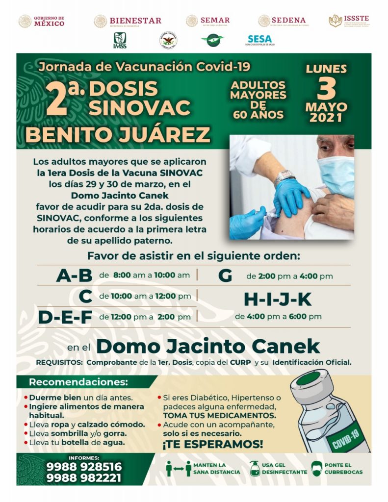 Cancún, Q. Roo; viernes 30 de abril del 2021, poderycritica.- El próximo lunes 3 y martes 4 de mayo en Cancún se realizará la aplicación de la segunda dosis de la vacuna SINOVAC para los adultos mayores de 60 años.