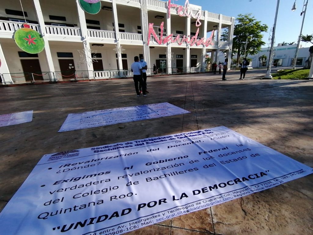 Mencionaron que aunque es el Gobierno Federal quien ha incumplido con los pagos, el pliego petitorio es para el Gobernador de Quintana Roo, Carlos Joaquín González, pues es quien ciñe los convenios de colaboración entre Gobierno del Estado, Colegio Bachilleres y la Secretaría de Educación.