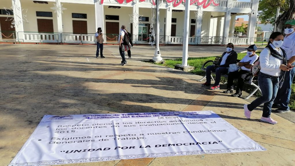 “Nuestra queja es nuestro pleito conforme derecho en reclamar lo que nos deben, es decir la política salarial 2020; año con año nos daba nuestro incremento salarial entre junio y Julio , pero ya llegamos a diciembre y no se nos ha respondido, este incremento va del 1 al 3% con base a nuestro sueldo, qué es retroactivo a partir del 1 de febrero, además el incentivo que se ganaron los maestros por su evaluación docente, Éste último se les empezaron a pagar pero se los quitaron, esta es la parte medular”, José Sulú Martínez, secretario general del sindicato de trabajadores del colegio Bachilleres de Quintana Roo.