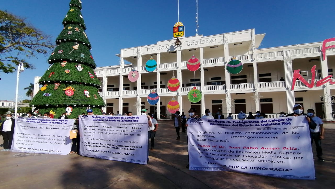 “Nuestra queja es nuestro pleito conforme derecho en reclamar lo que nos deben, es decir la política salarial 2020; año con año nos daba nuestro incremento salarial entre junio y Julio , pero ya llegamos a diciembre y no se nos ha respondido, este incremento va del 1 al 3% con base a nuestro sueldo, qué es retroactivo a partir del 1 de febrero, además el incentivo que se ganaron los maestros por su evaluación docente, Éste último se les empezaron a pagar pero se los quitaron, esta es la parte medular”, José Sulú Martínez, secretario general del sindicato de trabajadores del colegio Bachilleres de Quintana Roo.