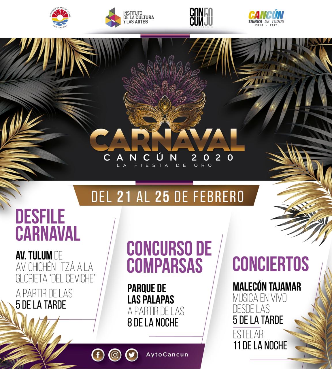 De acuerdo con el Instituto de la Cultura y las Artes, para el viernes los cancunenses podrán disfrutar en Las Palapas la presentación oficial de la corte real; los días sábado, domingo y lunes, el concurso de comparsas; mientras que el martes, el cierre con el tradicional baile de comparsas.