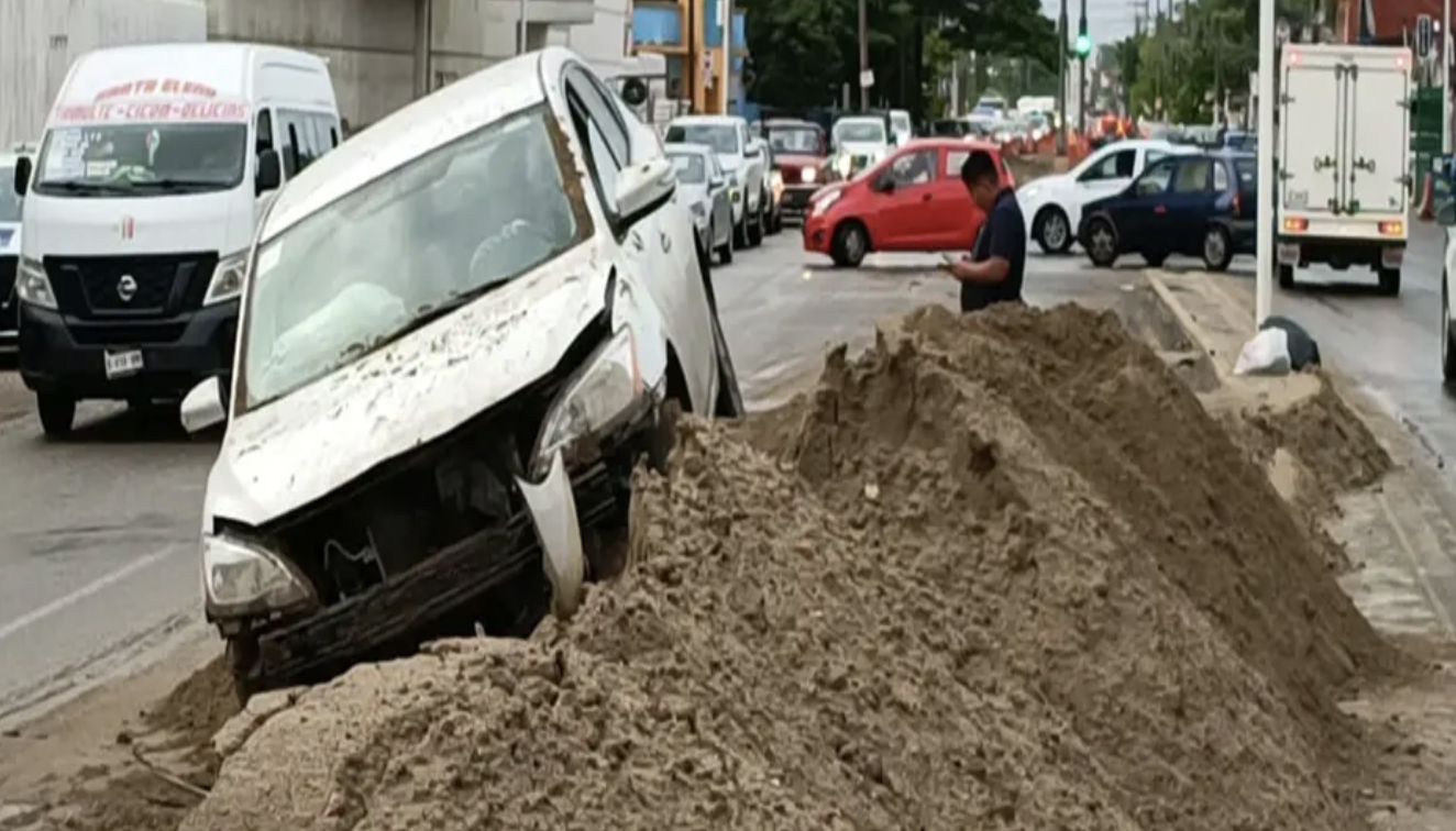 El primer percance ocurrió sobre la vía La Isla–Villahermosa, a la altura de la Torre Oncológica del Hospital Dr. Juan Graham Casasús, donde un automovilista perdió el control y terminó sobre un montículo de arena utilizado en los trabajos de drenaje de la zona.