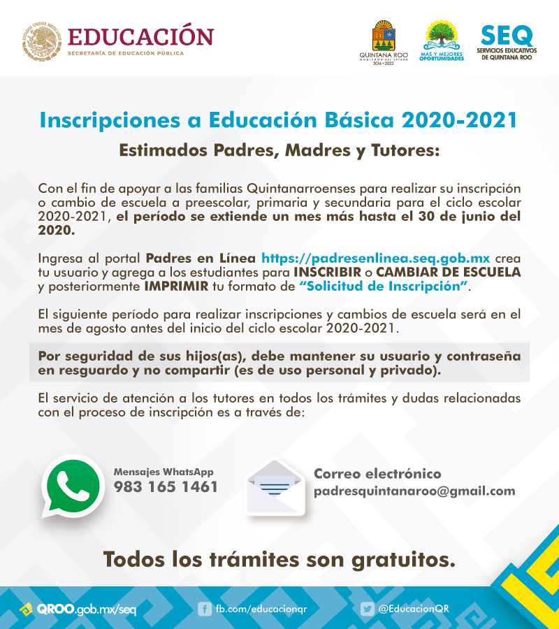 Chetumal, Q. Roo, Lunes 29 de Junio de 2020, poderycrítica.- El proceso de inscripción o cambio de escuela de preescolar, primaria y/o secundaria para el ciclo escolar 2020-2021 en Quintana Roo, se extiende hasta el 30 de junio del 2020.