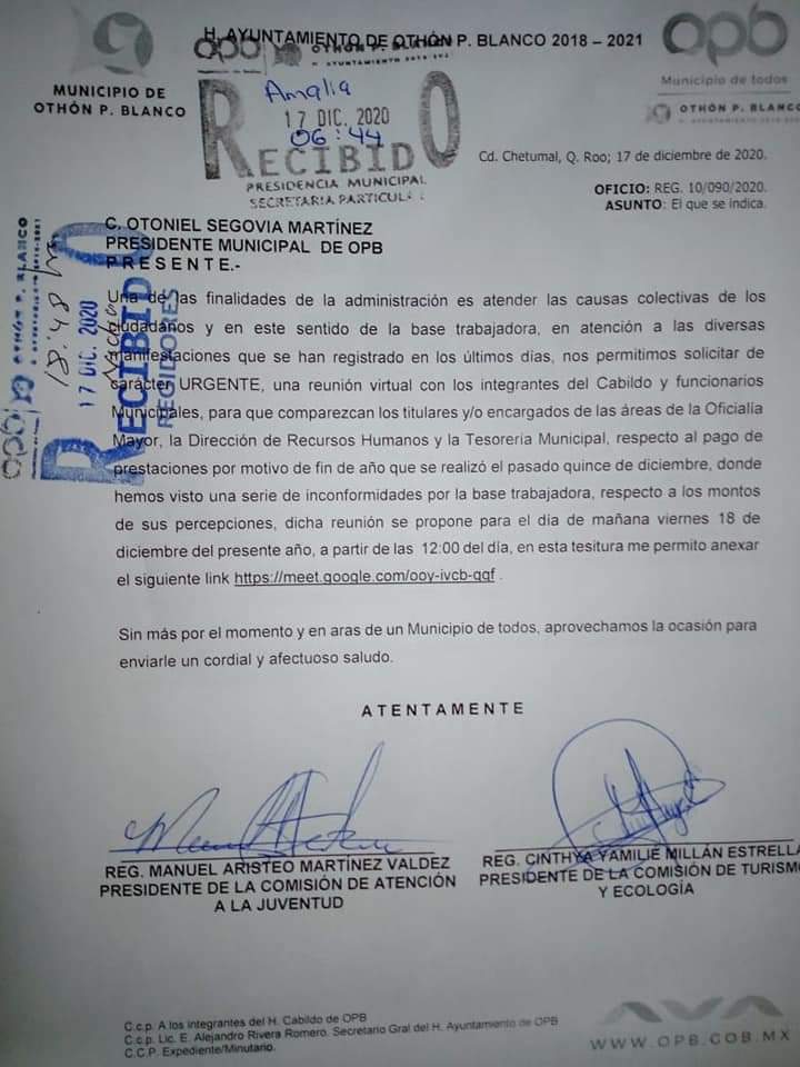 Chetumal, Q. Roo, Viernes 18 de Diciembre de 2020, poderycrítica. – El presidente municipal Otoniel Segovia Martínez no aceptó la propuesta de una reunión virtual con regidores para abordar el tema del descuento al aguinaldo de los trabajadores del Ayuntamiento.