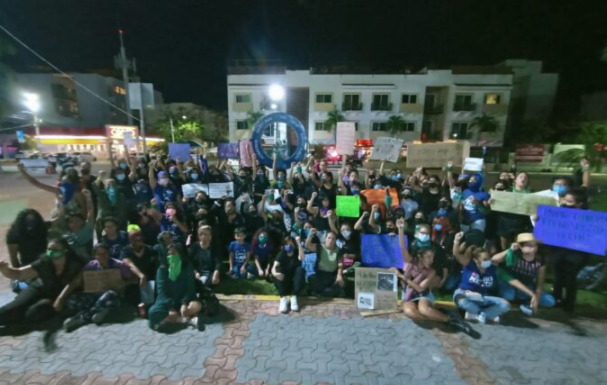 Playa del Carmen, Quintana Roo, Viernes 26 de Noviembre del 2021, Poder y Crítica | Colectivos feministas de este municipio se manifestaron de manera pacífica, con una marcha a través de la Quinta Avenida, para luego dirigirse a la plaza 28 de Julio, frente al Palacio Municipal, en donde colocaron una “antimonumental”, para honrar a las víctimas de la violencia de género.