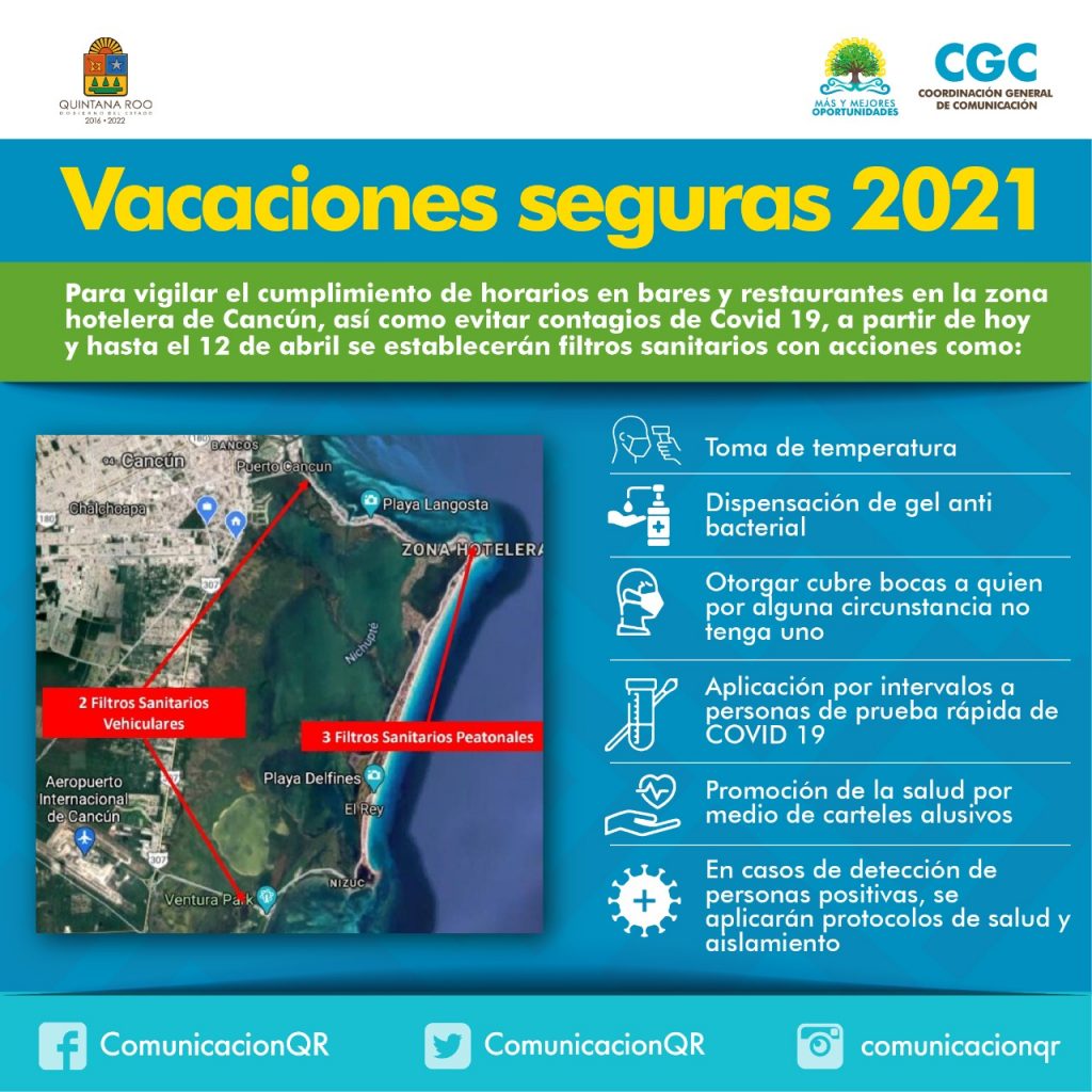 Chetumal, Q. Roo, Martes 30 de Marzo de 2021, poderycrítica.- Para tener unas vacaciones seguras y evitar contagios de covid-19 en semana santa, a partir de hoy y hasta el 12 de abril se establecerán acciones preventivas en la zona hotelera de Cancún, así como de otros destinos del estado. Se vigilará el cumplimiento de horarios en bares y restaurantes.