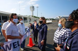 En el arribo de este vuelo acompañaron al Presidente Municipal, Pablo Aguilar Torres, representante del CPTQ en Cozumel; Terri Barnhart-Ocejo, agente Consular de Estados Unidos en la isla, y Jorge Campos Romero, Administrador del Aeropuerto Internacional de Cozumel.
