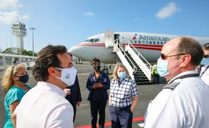 Cozumel, Q. Roo, Lunes 21 de Diciembre del 2020, poderycrítica.- Durante el arribo del vuelo de American Airlines, proveniente de Chicago, el Presidente Municipal, Pedro Joaquín Delbouis, destacó que la reactivación económica y turística de Cozumel continúa de forma segura, al aplicarse de manera rigurosa los protocolos sanitarios a todos los visitantes.
