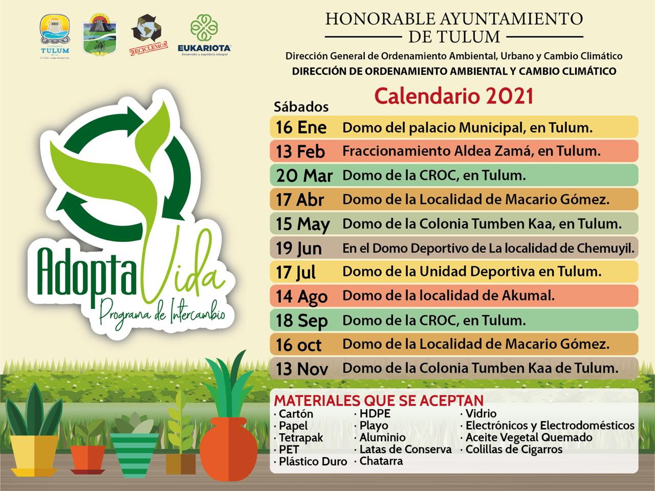 Respecto al programa “Adopta Vida”, las fechas corresponden al tercer sábado de cada mes, y para la cabecera municipal de Tulum quedaron de la siguiente manera: el primero del año será este 16 de enero en el domo del palacio municipal; 13 de febrero en el fraccionamiento Aldea Zama; 20 de marzo en el domo del parque de la CROC, donde retornan el 18 de septiembre; el 15 de mayo será en la colonia Tumben Kah y retornan el 13 de noviembre al mismo lugar y el 17 de julio en la unidad deportiva Tulum.